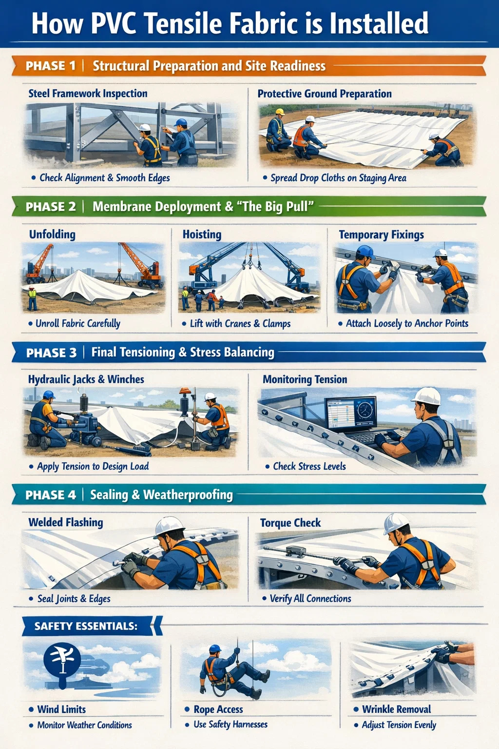 A PVC szakító szövet a szerkezet csak akkor "strukturális", ha feszültség alatt van. Megfelelő megfeszítés nélkül a szövet csapkodna a szélben, ami fáradtságot és esetleges meghibásodást okoz. Ez a fázis magában foglalja a szövet felhúzását stressz előtti szintek , jellemzően től kezdve 1,0-5,0 kN/m a mérnöki követelményektől függően.