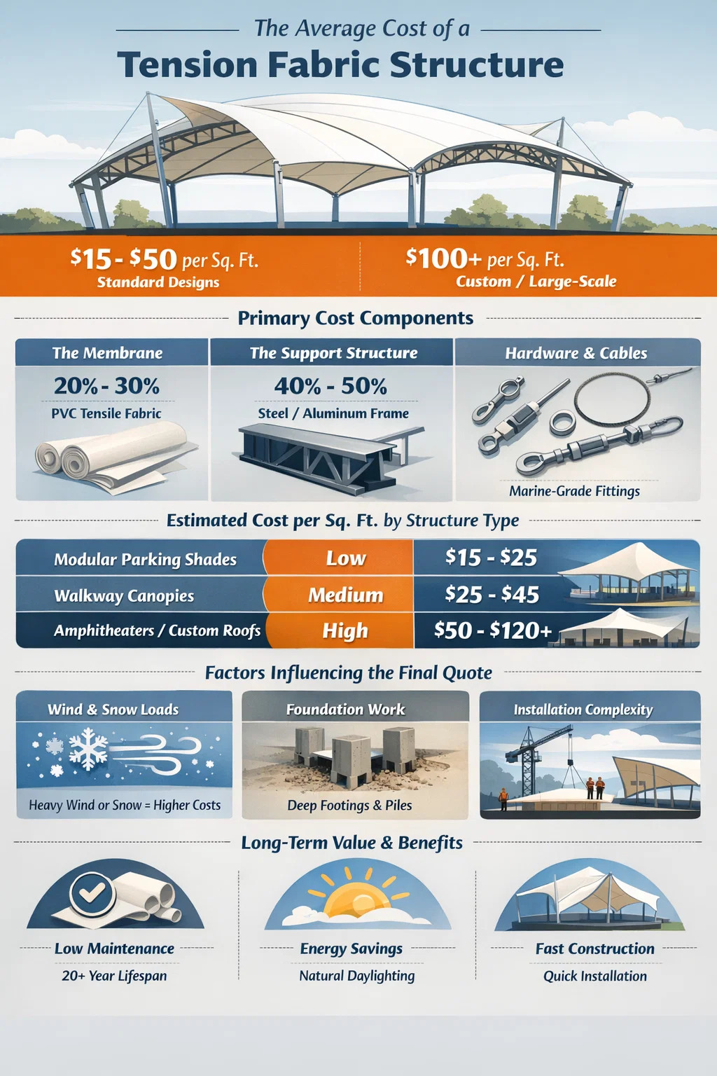 A feszített szövetszerkezet költsége jellemzően a 15-50 dollár négyzetméterenként szabványos tervek esetében, míg a nagymértékben testreszabott vagy nagyszabású építészeti projektek meghaladhatják 100 dollár négyzetméterenként . Ez az ár nem csak a PVC szakító szövet magát; egy komplett rendszert foglal magában, beleértve a tervezett acélvázat, speciális vasalatokat, alapozási munkákat és szakértői szerelési munkákat. Mivel ezeket a szerkezeteket egyedileg úgy tervezték, hogy ellenálljanak az adott szél- és hóterhelésnek, az árak a földrajzi elhelyezkedéstől és a tervezés bonyolultságától függően ingadoznak.