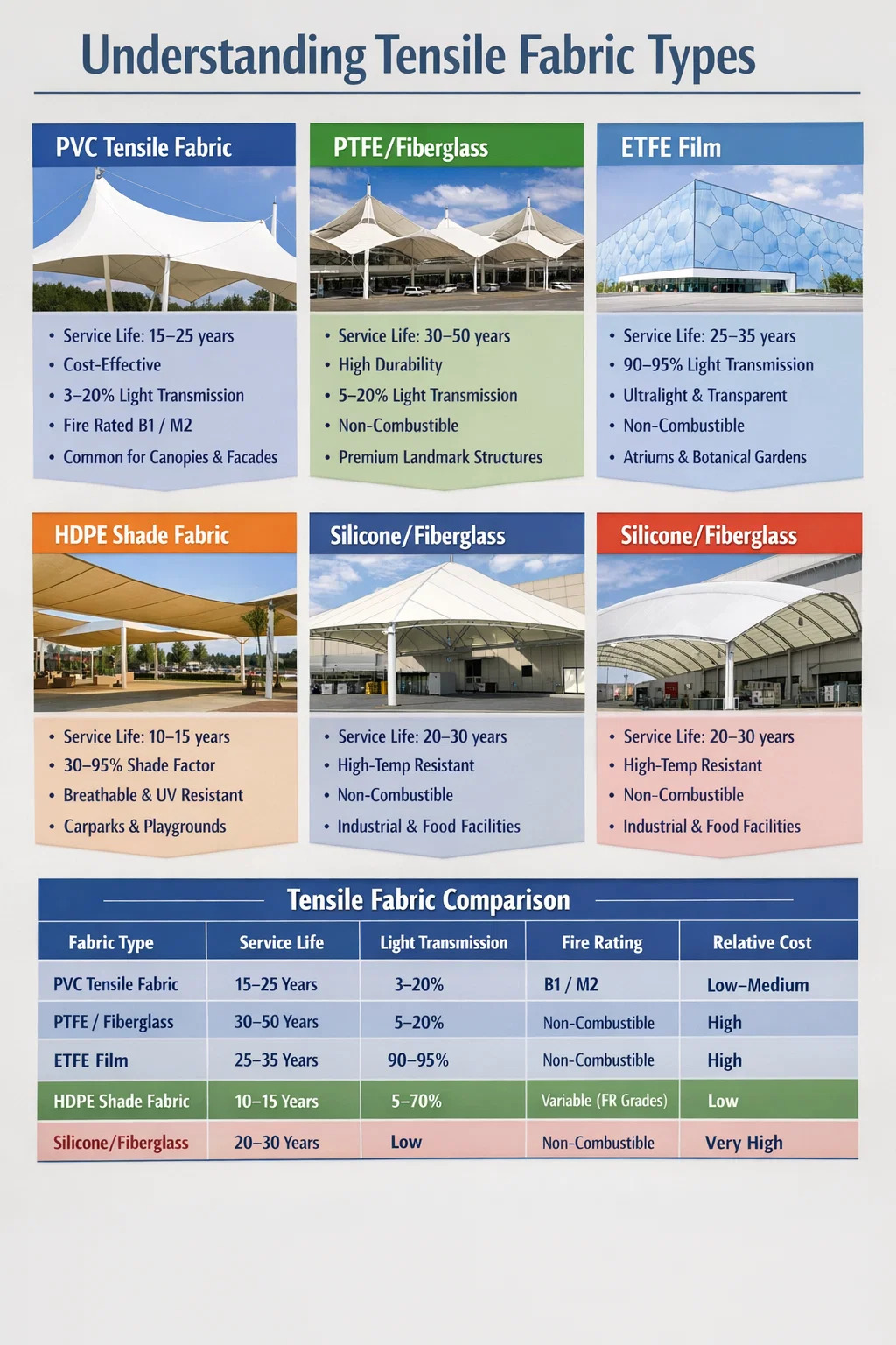 | PTFE/üvegszál | 30-50 év | 5-20% | Nem éghető | Magas | Repülőterek, stadionok, nevezetes tetők |