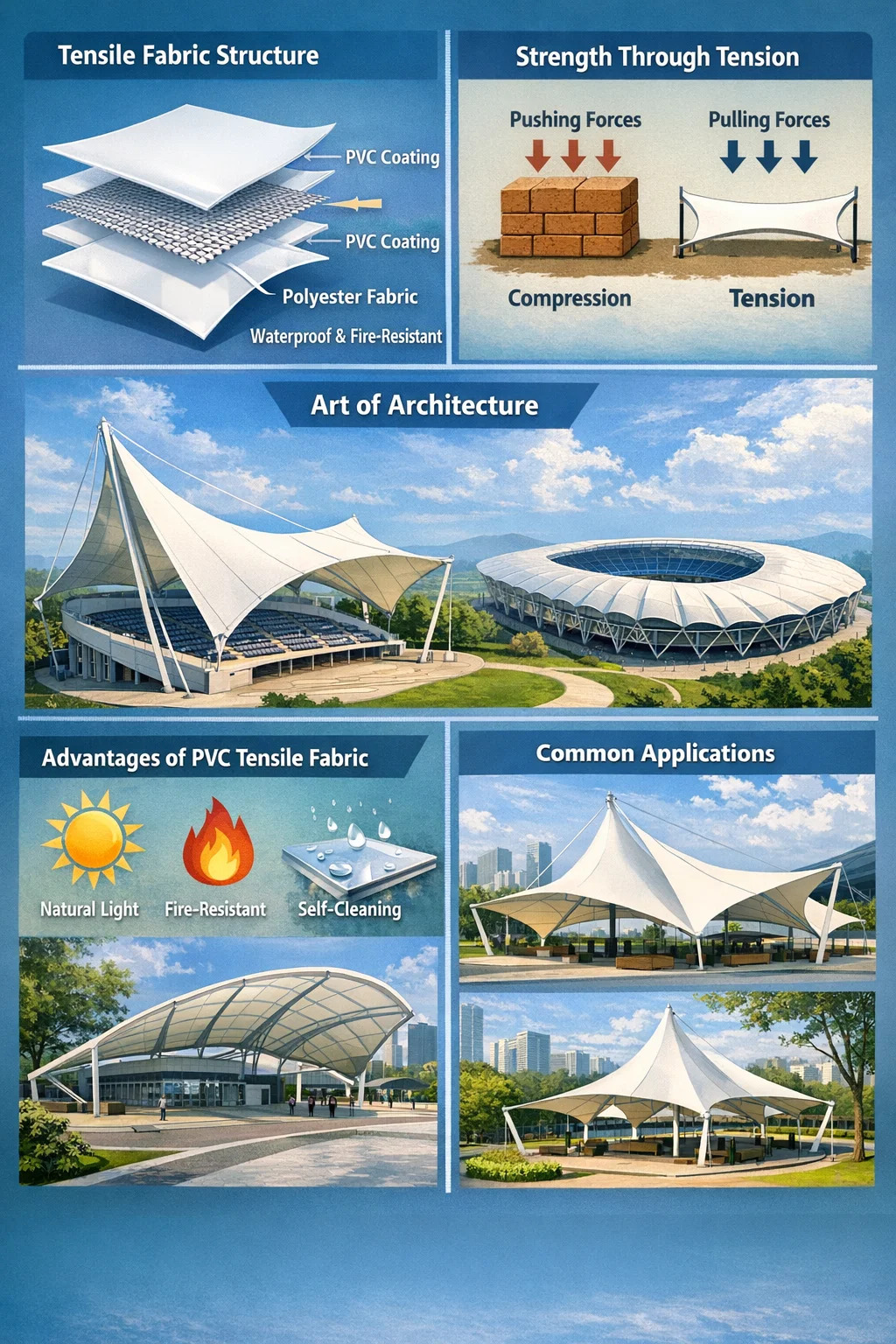 Könnyű és átlátszó: Rendkívül nagy területeket képes lefedni (például egy teljes stadion lelátót), de nem igényel alatta sűrű oszlopokat, kiváló térérzetet biztosítva.