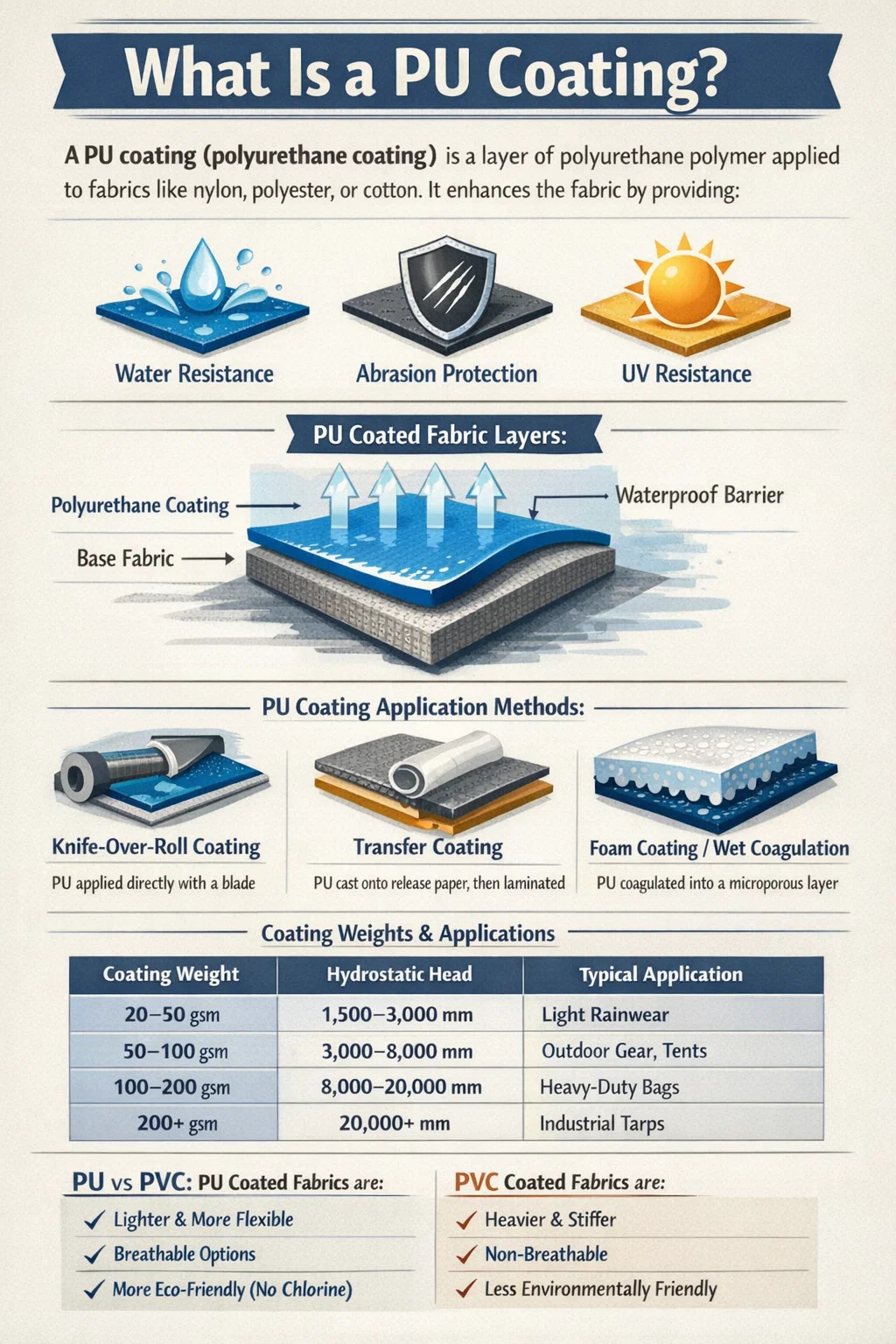Gyakorlatilag, amikor egy PU-bevonatú szövetet kezel, olyan anyagot érint, amelyet úgy terveztek, hogy nagyon eltérően viselkedjen a bevonat nélküli megfelelőjétől. A poliuretán réteg vastagsága általában 0,05 mm és több mint 1,5 mm közötti , a végfelhasználástól függően – egy könnyű esőruházati szövet mindössze 20-30 gramm/m² vastagságú bevonatot kaphat, míg a nagy teherbírású ipari ponyva 200 g/m2-t meghaladó bevonatot hordozhat.