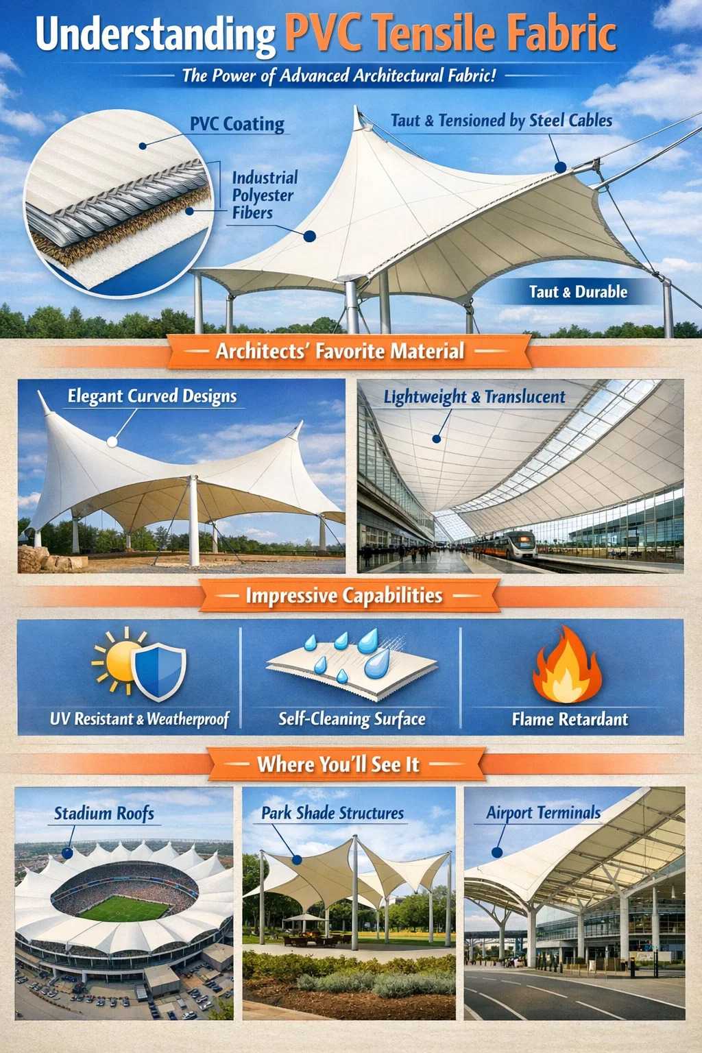 Sokoldalú formák: Nyeregformákra, sátorformákra, vagy különféle elegáns ívekre nyújtható. Gyakran láthatja ezeket a művészi formákat stadionokban, szabadtéri színházakban vagy csúcskategóriás parkolóházakban.