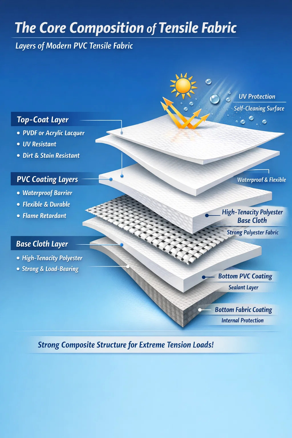 A legmodernebb PVC szakító szövet egy kifinomult kompozit anyag, amely három elsődleges rétegből áll: a nagy szakítószilárdságú poliészter alapkendő , egy vastag PVC (polivinil-klorid) bevonat , és egy speciális fedőlakk mint például a PVDF vagy az akril. A belső szövet szerkezeti szilárdságot biztosít a hatalmas feszültségek elviseléséhez, míg a külső műanyag rétegek megvédik a szálakat a környezeti károsodástól, a víztől és a tűztől.